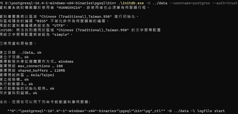 .\initdb.exe -D ..\data --username=postgres --auth=trust