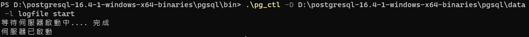 .\pg_ctl -D D:\postgresql-版本號-windows-x64-binaries\pgsql\data -l logfile start