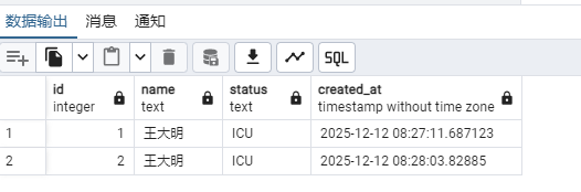 psql -c "INSERT INTO patient_data (name, status, created_at) VALUES ('王小明',