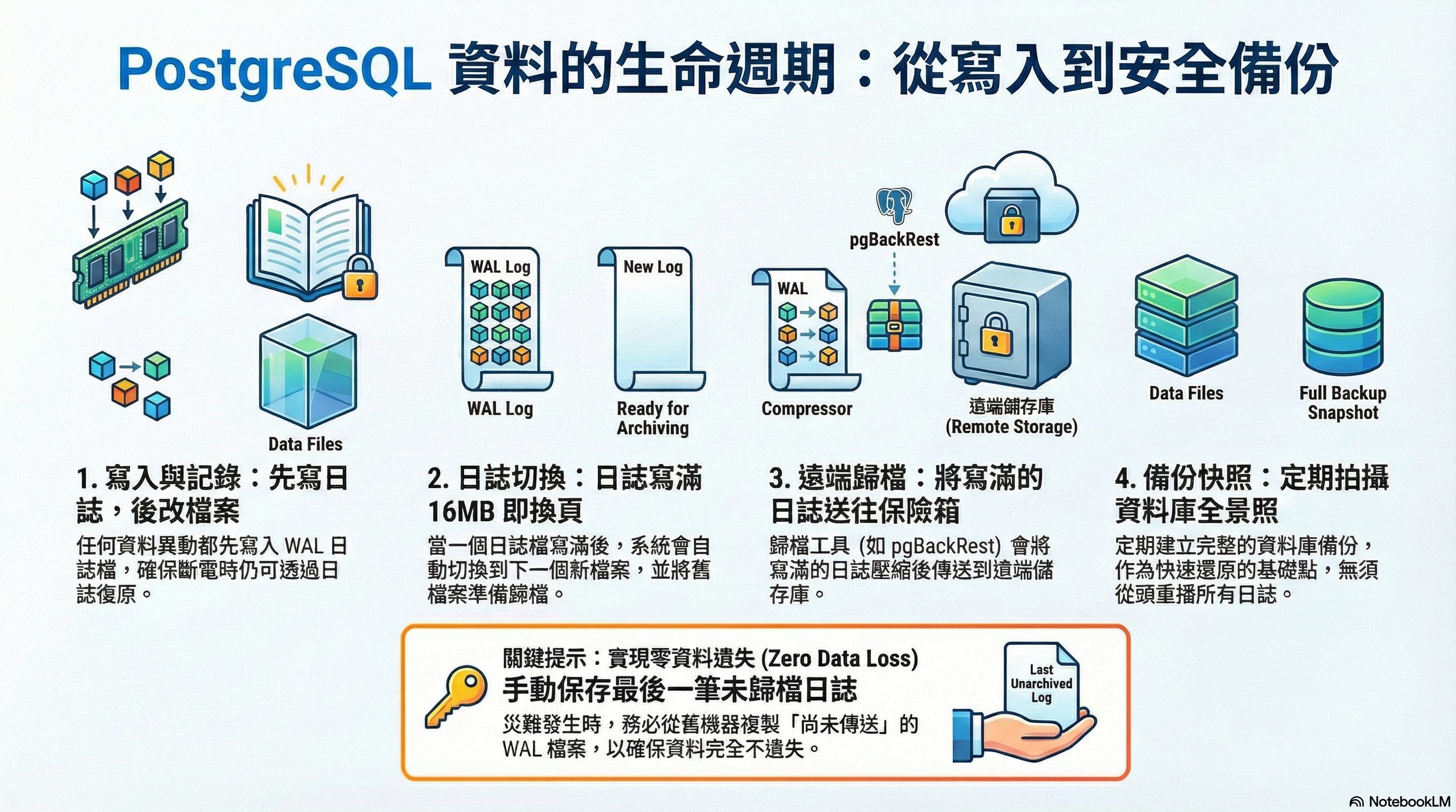 | 3. 歸檔 | Archive | 送往檔案室 | 搬運工(pgBackRest)立刻把寫滿的舊本子拿走,壓縮打包送去遠處的防火檔案室(Repo)。 |